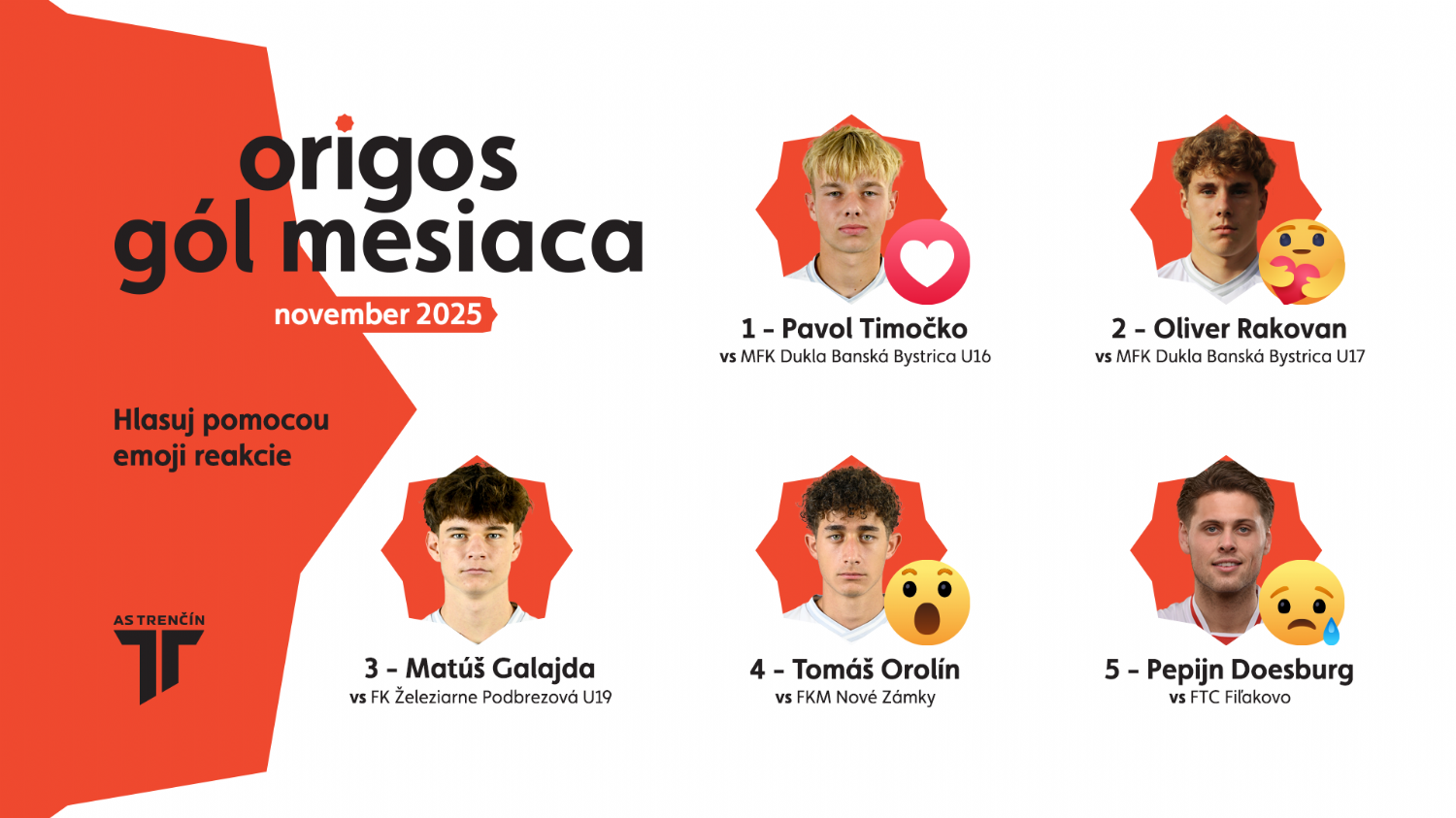 Aj v sezóne 2025/2026 pokračujeme s klubovou anketou Origos Gól mesiaca. Rozhodnete svojimi hlasmi o víťazovi novembrovej edície, ktorý získa zaujímavú cenu od hlavného partnera projektu. V nominácii sú Pavol Timočko (U16), Oliver Rakovan (U17), Matúš Galajda (U19), Tomáš Orolín (B-tím) a Pepijn Doesburg (A-tím). Hlasovať môžete na facebookovom profile AS Trenčín. Z hlasujúcich vyberieme jedného z fanúšikov, ktorý získa dve vstupenky na zápas Niké ligy.